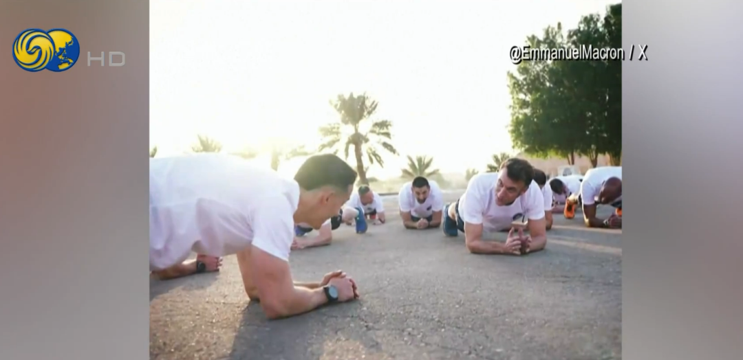 马克龙发布了一段视频,视频内容显示,他在阿联酋首都阿布扎比,与法国健身网红蒂博·德拉帕特以及驻扎在当地的法军一同开展健身活动。视频中,蒂博·德拉帕特指导马克龙与法军士兵进行热身运动,随后众人一同做俯卧撑,还完成了一系列肌力与核心训练,并进行了跑步锻炼。