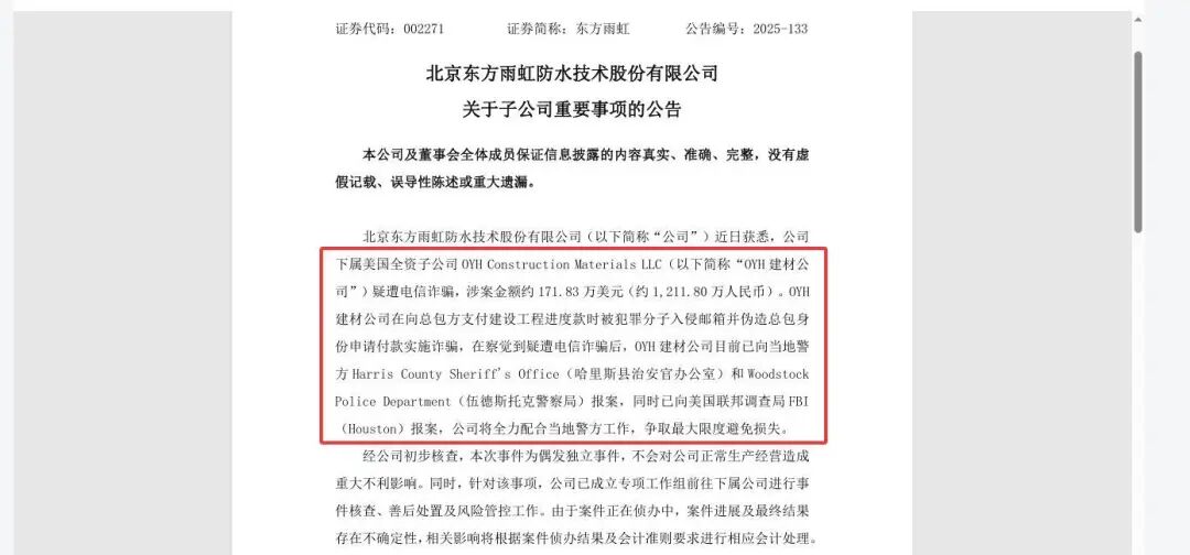 12月23日晚,A股上市公司东方雨虹(002271)公告,该公司下属美国全资子公司OYH建材公司近日疑遭电信诈骗,涉案金额约171.83万美元(约1211.80万元人民币)。目前,该公司已向美国联邦调查局FBI(Houston)报案,案件正在侦办中。