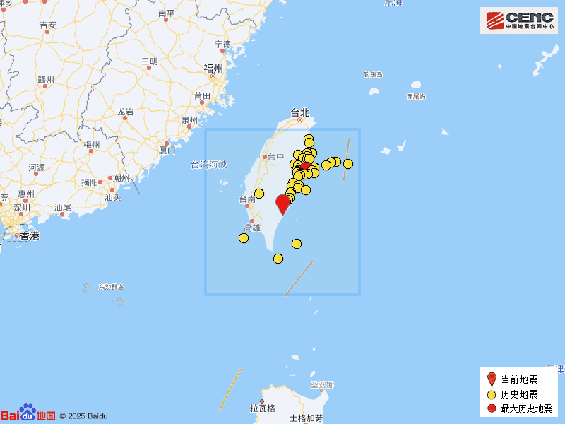 历史地震:根据中国地震台网速报目录,震中周边200公里内近5年来发生4级以上地震共389次,最大地震是2024年4月3日在台湾花莲县海域发生的7.3级地震(距离本次震中123公里),按震级大小前50次历史地震分布如图。