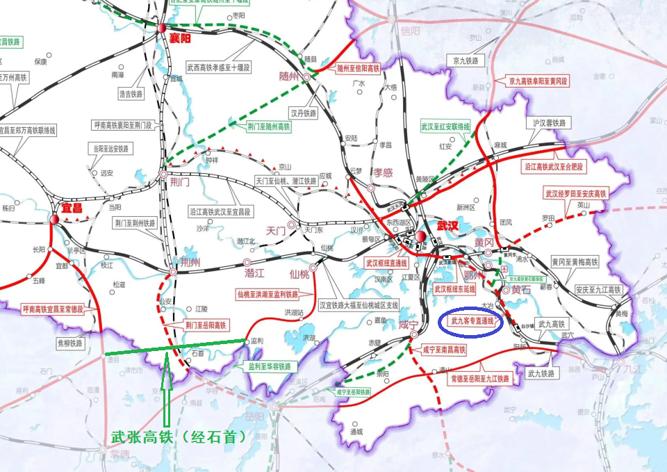 武九高铁直通线项目已纳入《武鄂黄黄规划建设纲要大纲》。该项目即“福银高铁补强工程”,在武汉枢纽直通线东延线规划基础上新建武汉新城站—黄石白沙铺段,长约75公里,拟规划时速350公里。