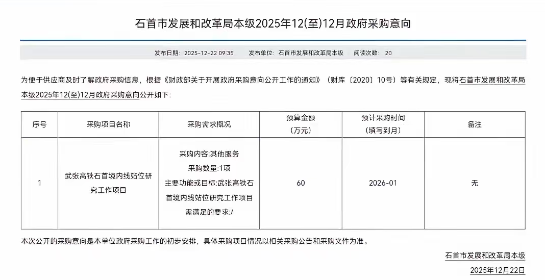 12月份,黄石市发改委武九高铁直通线规划研究以及石首市发改局武张高铁石首境内线站位研究采购意向发布,合计预算260万元。