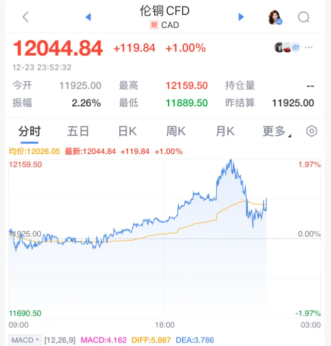 另据中国基金报报道,23日晚间,白银大涨并刷新历史新高,一度上涨2.4%。铜价23日晚也创出新历史高位,伦敦金属交易所期铜一度突破每吨12000美元,达到12044美元。