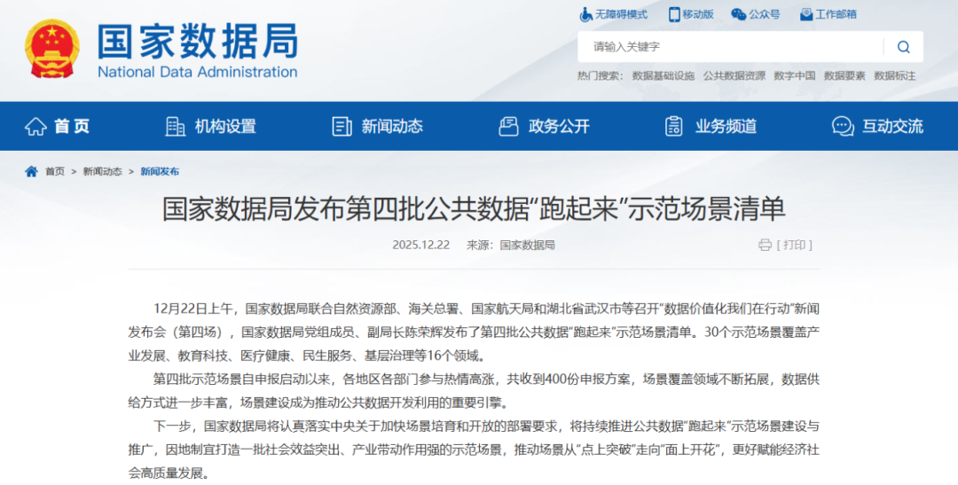 至此,我国已发布四批次共100个公共数据“跑起来”示范场景。