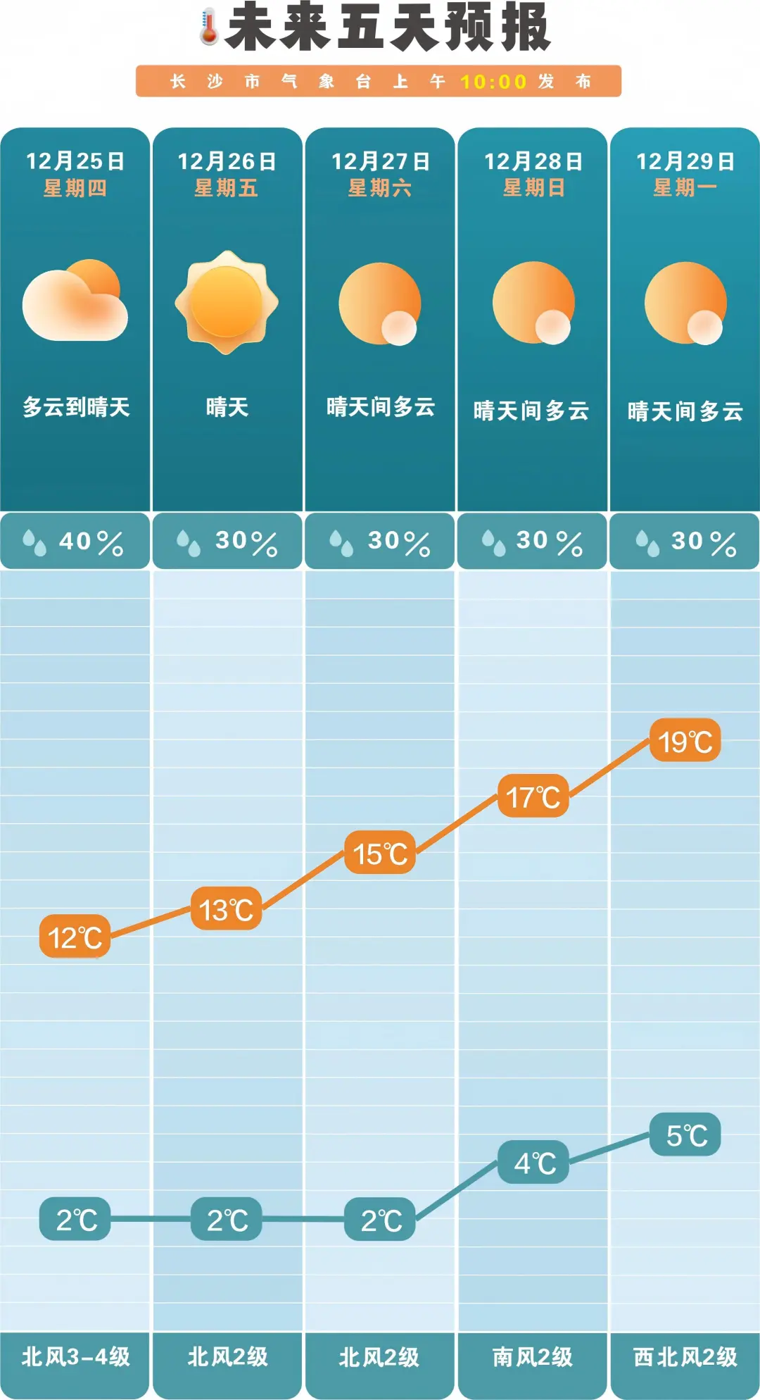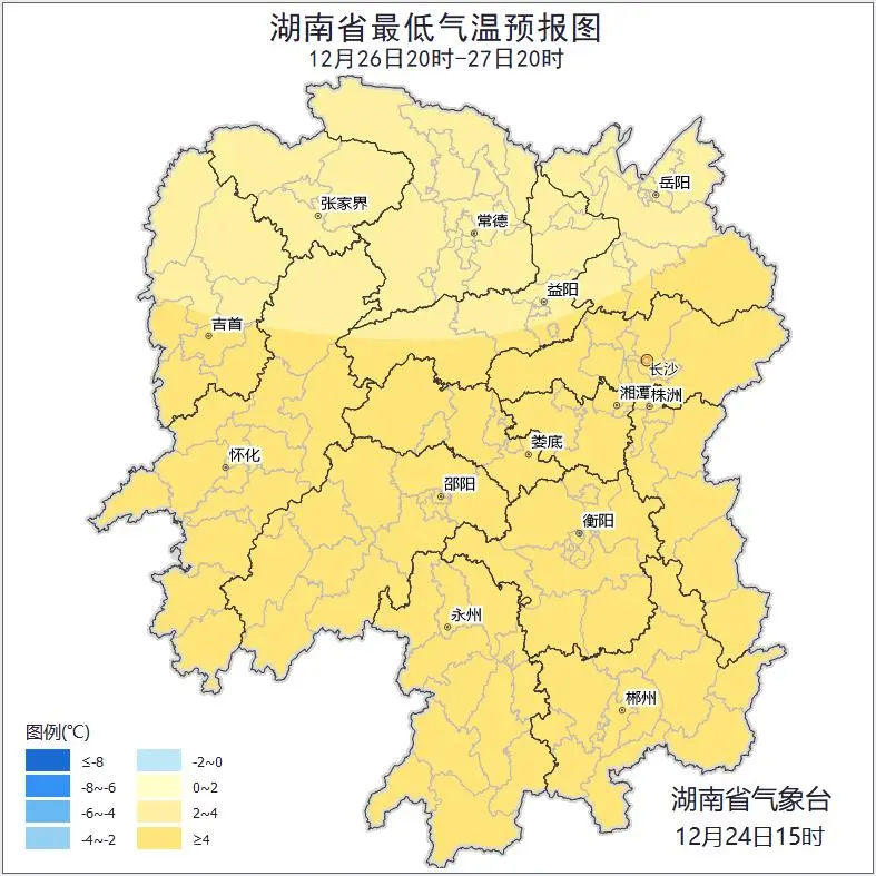 25日晚上至26日白天,多云间晴天,清晨湘西北局地有雾;北风3~4级减小至2~3级;最低气温1~4℃;最高气温12~14℃。