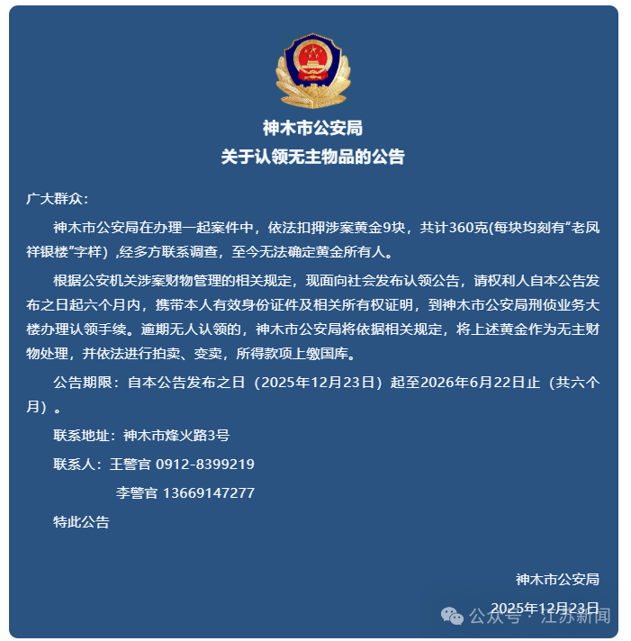 根据公安机关涉案财物管理的相关规定,现面向社会发布认领公告,请权利人自本公告发布之日起六个月内,携带本人有效身份证件及相关所有权证明,到神木市公安局刑侦业务大楼办理认领手续。逾期无人认领的,神木市公安局将依据相关规定,将上述黄金作为无主财物处理,并依法进行拍卖、变卖,所得款项上缴国库。