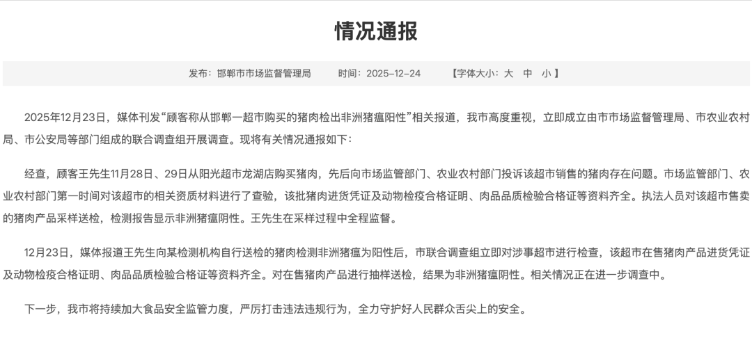 邯郸市联合调查组12月24日通报,12月23日,媒体刊发“顾客称从邯郸一超市购买的猪肉检出非洲猪瘟阳性”相关报道,邯郸市高度重视,立即成立由市市场监督管理局、市农业农村局、市公安局等部门组成的联合调查组开展调查。现将有关情况通报如下: