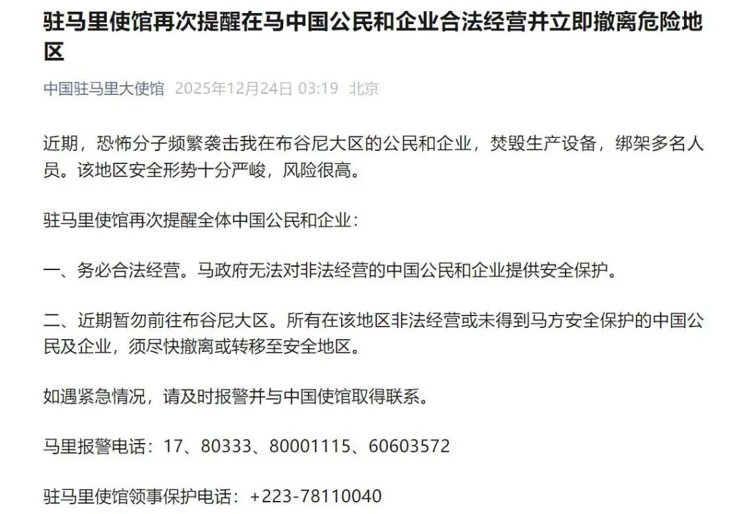 12月24日,中国驻马里大使馆发文,提醒在马中国公民和企业合法经营并立即撤离危险地区。
