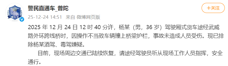 2025年12月24日12时40分许,杨某(男,36 岁)驾驶厢式货车途经武威路外环跨线桥时,因操作不当致车辆撞上桥梁护栏,事故未造成人员受伤。现已排除杨某酒驾、毒驾嫌疑。