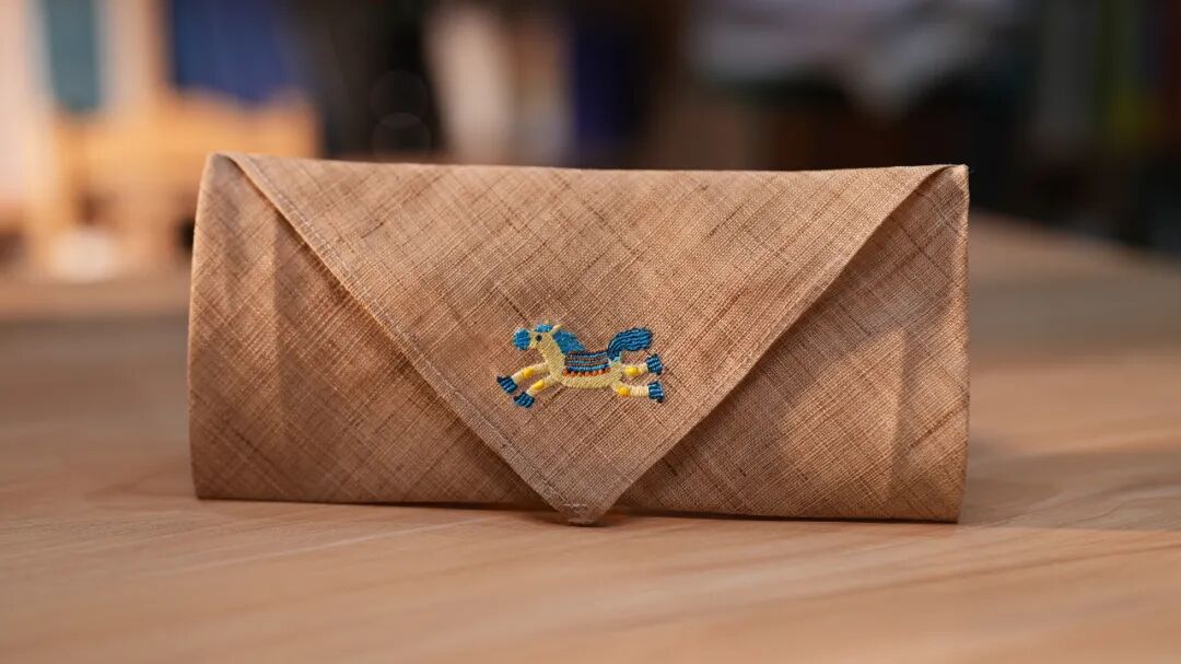 非遗传承人马琳沁手作夏布,制成书衣袋,从田间草木到随身书衣,每一道经纬都有独一无二的灵动纹理。书衣袋绣有一匹跃动的小马,寓意在生活间隙中,随时随地可以“马”上阅读。