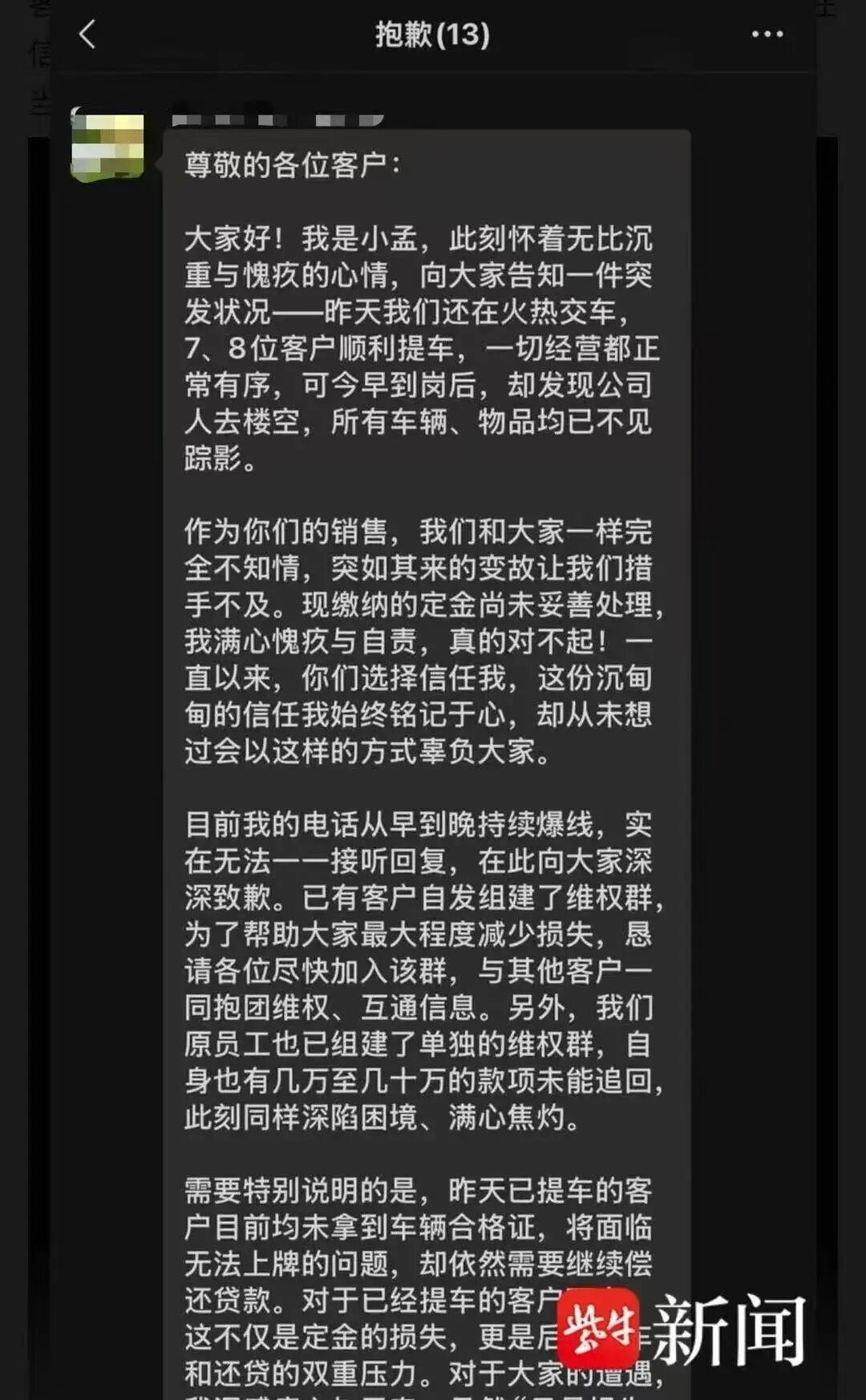 记者从一个近两百人的车主维权群了解到,此次事件中,受影响消费者的购车定金金额从2万元到数十万元不等;另有多位车主反映,此前已购买该门店的“终身保养”套餐或其他预充值服务可能也已无法兑换,涉及金额多在数万元。