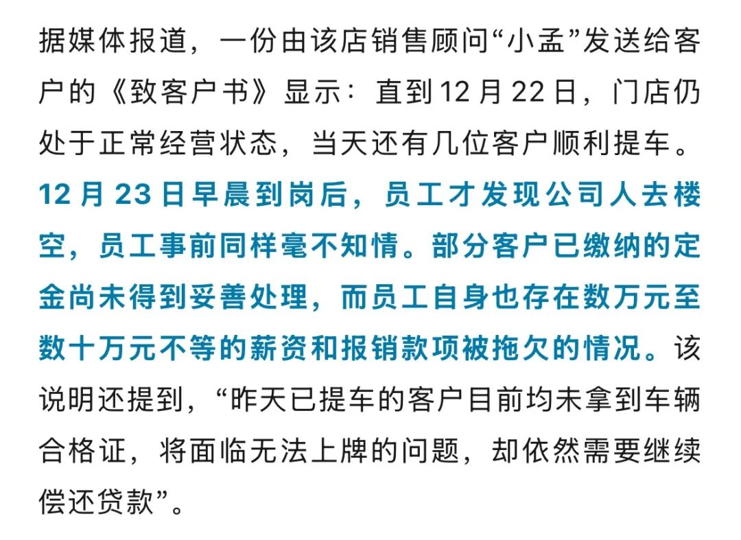 近日,记者注意到,12月23日晚,多位网友在社交媒体平台发文称,位于郑州市中原区大中原国际汽车城的郑州中原保时捷中心,疑似突然“跑路”,展厅车辆几乎被清空,消费者也难以与销售人员取得联系。12月24日下午,中原区商务局工作人员就此事向记者回应称,相关部门已成立专班,正初步介入调查协调。
