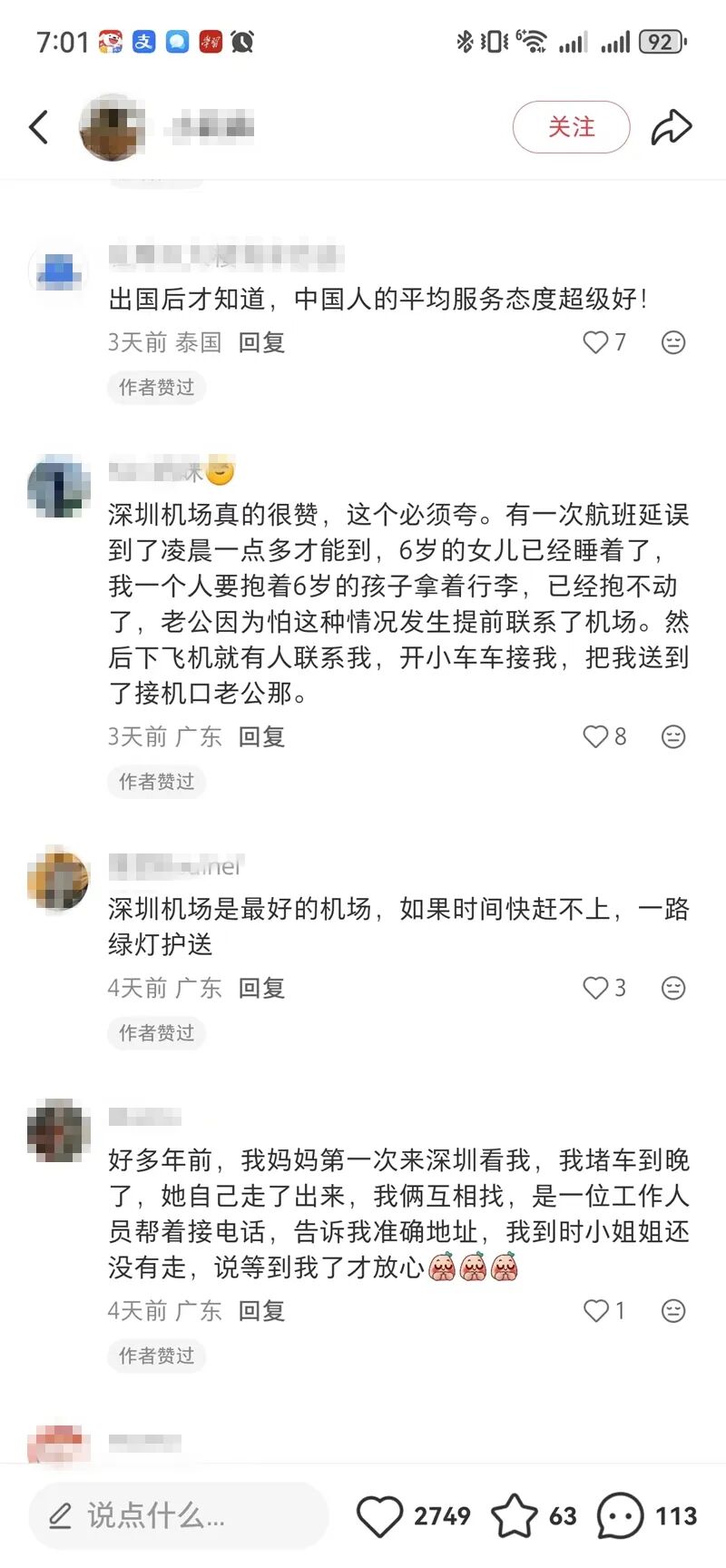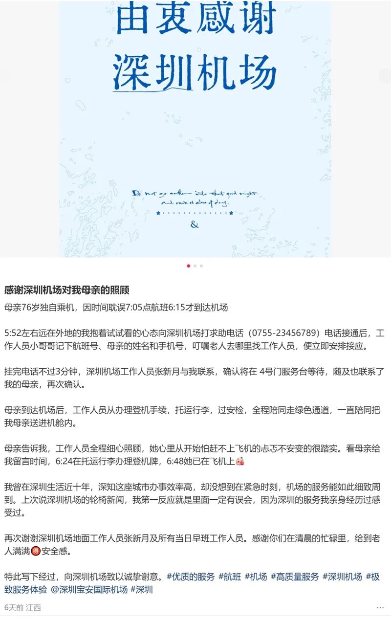 近日,深圳机场工作人员张馨月对独自乘机老人的紧急爱心帮扶,被老人女儿写成感谢信分享到社交媒体,感谢机场工作人员给予乘客满满的安全感。这封感谢信引发网友共鸣,多位网友留言分享自己的亲身经历,讲述他们在深圳机场的同款暖心事。