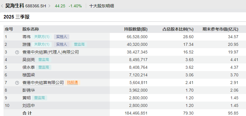 截至三季度末,蒋伟为昊海生科的第一大股东,持股数量为6652.8万股,持股占比为28.6%。