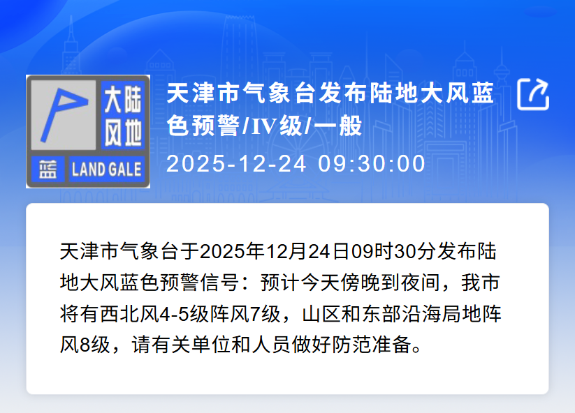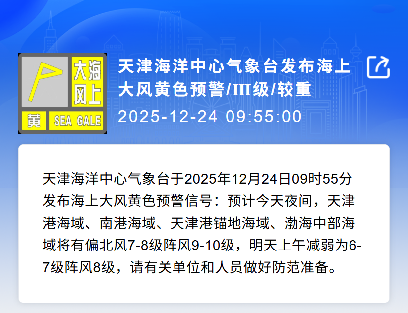 天津海洋中心气象台于2025年12月24日09时55分发布海上大风黄色预警信号:预计今天夜间,天津港海域、南港海域、天津港锚地海域、渤海中部海域将有偏北风7~8级阵风9级,明天上午减弱为6~7级阵风8级。
