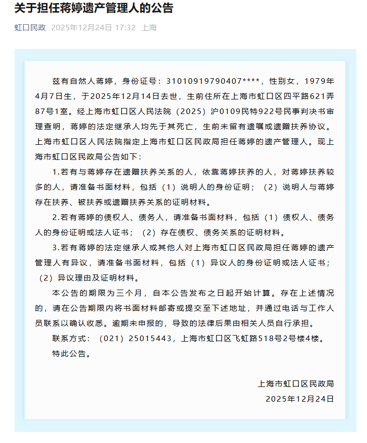 上海市虹口区民政局12月24日发布《关于担任蒋婷遗产管理人的公告》。