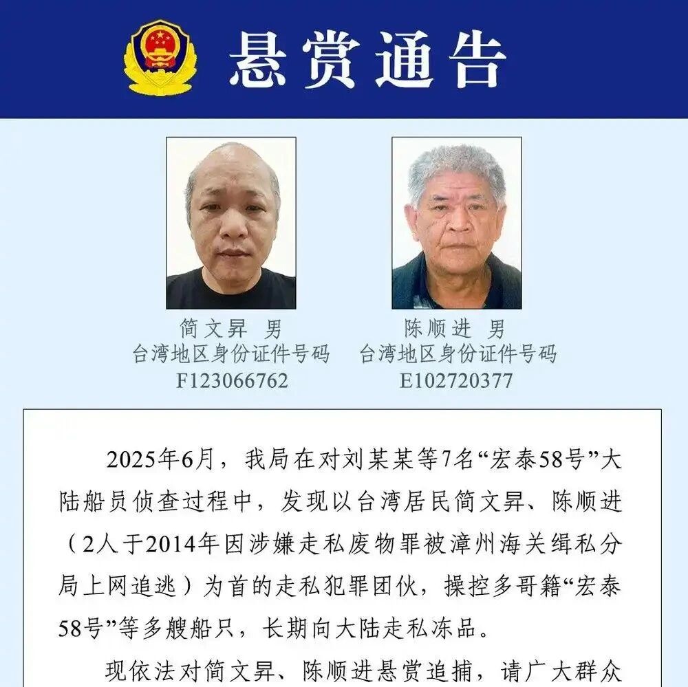 通告披露,2025年6月,威海市公安局在对刘某某等7名“宏泰58号”大陆船员侦查过程中,发现以台湾居民简文昇、陈顺进(2人于2014年因涉嫌走私废物罪被漳州海关缉私分局上网追逃)为首的走私犯罪团伙,操控多哥籍“宏泰58号”等多艘船只,长期向大陆走私冻品。