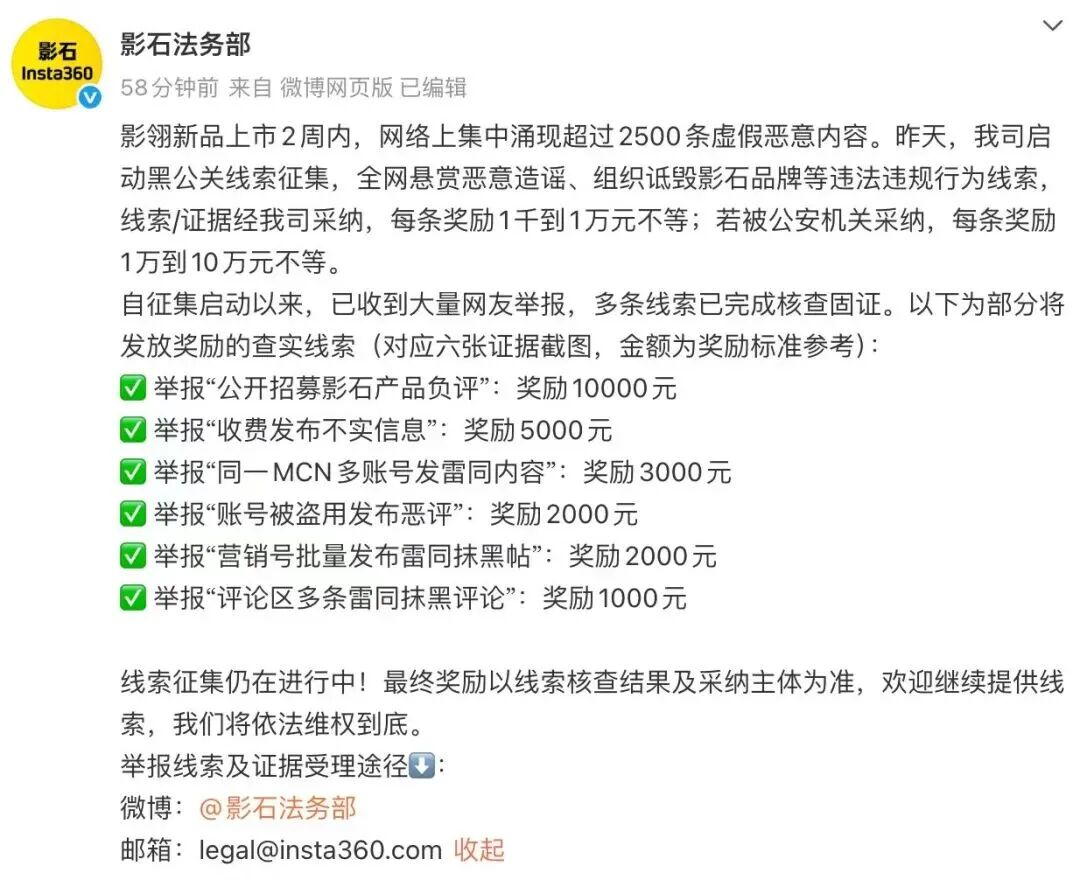 影石法务部称:针对此类恶意造谣、组织诋毁品牌的违法违规行为,公司发起全网悬赏,公开征集相关线索,若线索被公安机关采纳,最高可给予10万元奖励。