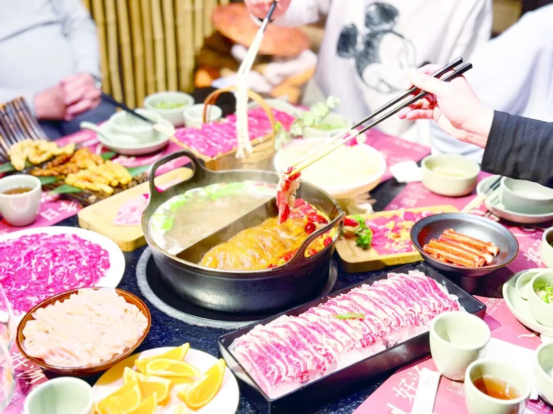 四川的“火锅搭子”文化,与文旅场景有着天然的契合度。游客往往在出发前就通过社交平台相约,或是在旅途中与同行游客、民宿室友临时组队,只为多点菜品、共享美味。毕竟,四川火锅的魅力不仅在于锅底的醇厚,更在于丰富的菜品选择。传统的毛肚、黄喉、鸭肠讲究“七上八下”的脆嫩口感,鲜鸭血、贡菜丸子是老饕必点的经典;近年来兴起的折耳根牛肉卷、芝士虾滑、虎皮凤爪等创新菜品,更让游客欲罢不能。没有“搭子”同行,单人点餐难以覆盖多样风味。“拼搭子”成了游客心照不宣的选择,既避免了浪费,又能解锁全菜单体验,让旅途美食不留遗憾。