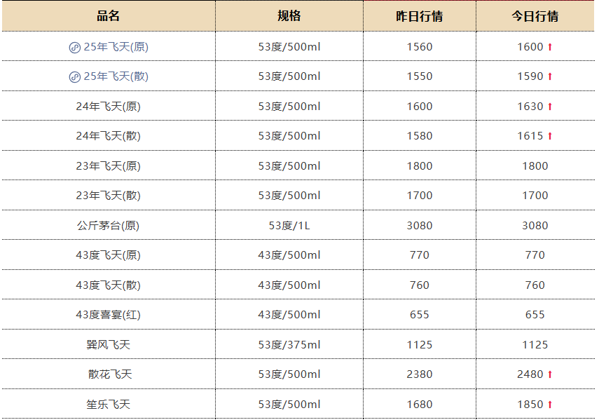 24年飞天茅台原箱报1630元/瓶,较上一日涨30元;24年飞天茅台散瓶报1615元/瓶,较上一日涨35元。