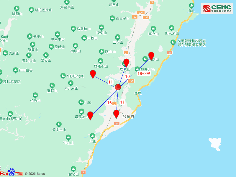 周边县城:震中距鹿野乡10公里、距台东市11公里、距延平乡11公里、距卑南乡16公里、距东河乡18公里,距台东县12公里,距台北市247公里。