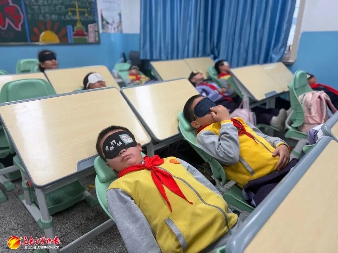 当天14时,午餐结束铃声刚落,学生们便有序整理好桌面,开始熟练地“改造”座椅。随着一连串“提、翻、拉、按”的流畅动作,课桌椅转眼变成一张张舒适的小床。孩子们调好靠背,戴上眼罩,盖好绒毯,渐渐沉入甜美的午睡时光。