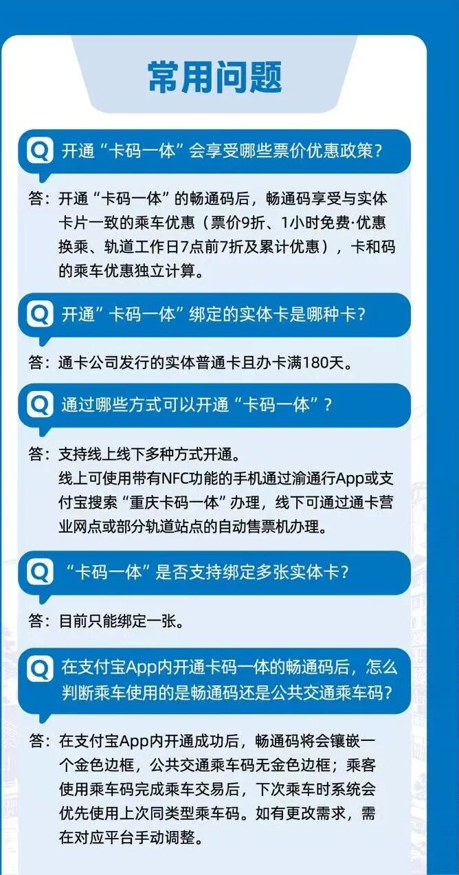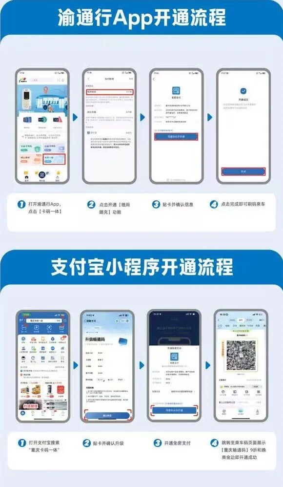 (一)线上便捷开通:持有具备NFC功能手机的乘客,可通过“渝通行”或支付宝APP进入“卡码一体”开通页面,按提示完成,一分钟内即可开通使用。