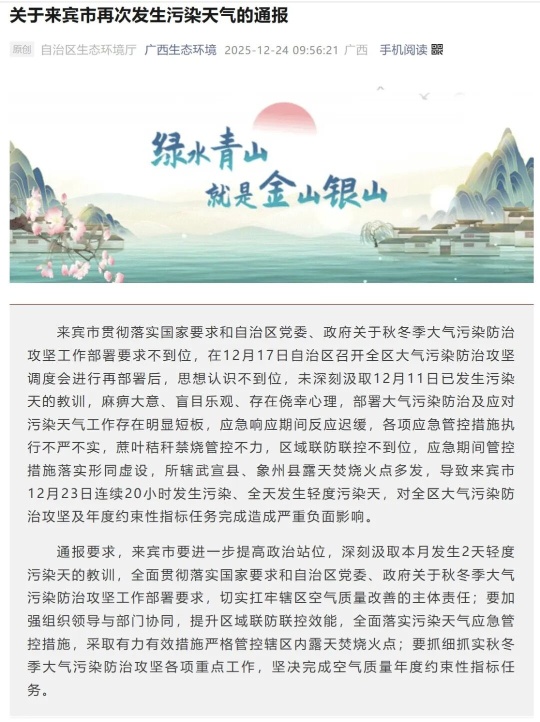 12月24日,自治区生态环境厅发布《关于来宾市再次发生污染天气的通报》,全文如下: