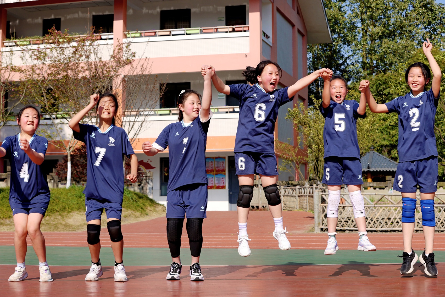 都江堰市石羊小学学生打赢排球比赛后欢呼庆祝。都江堰市石羊小学供图