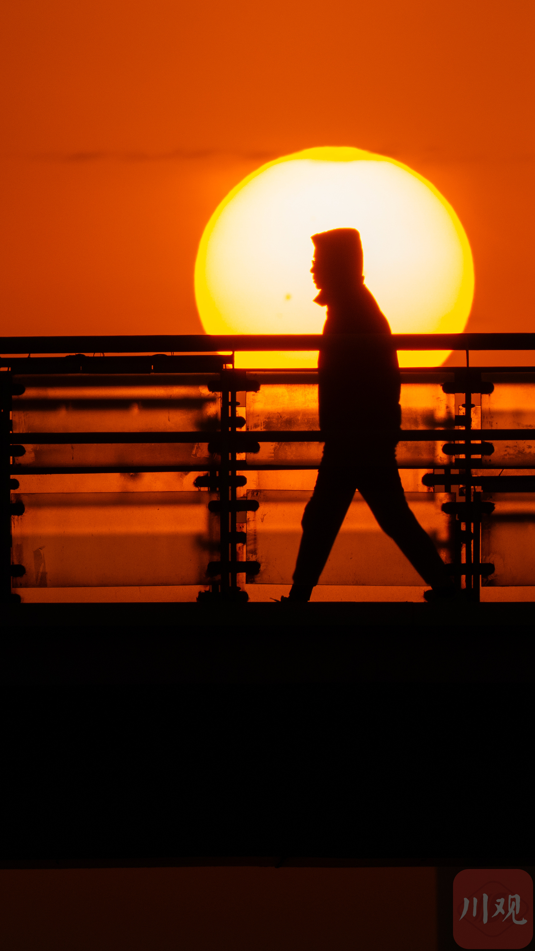 行人与升起的太阳“偶遇”。