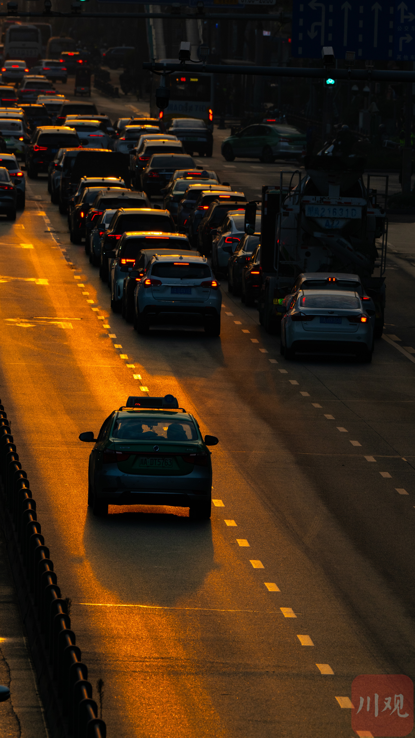 金色的阳光洒落在车流之中。