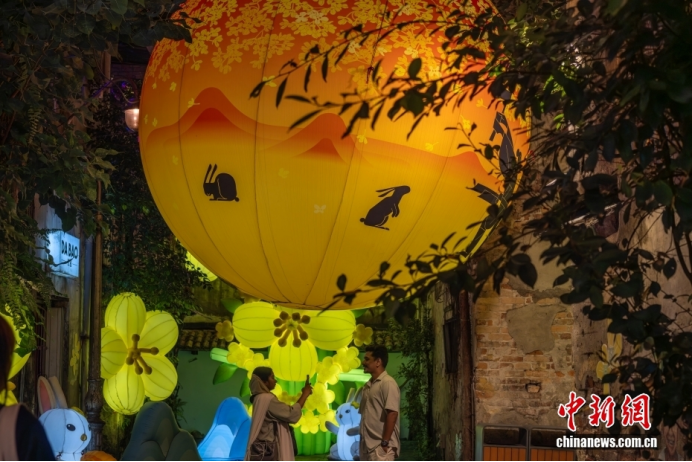 当地时间10月1日中秋节前夕,设在吉隆坡知名街巷鬼仔巷的“花月”灯笼艺术装置迎来众多民众参观。图为灯展中的巨型月亮灯。中新社记者陈悦 摄