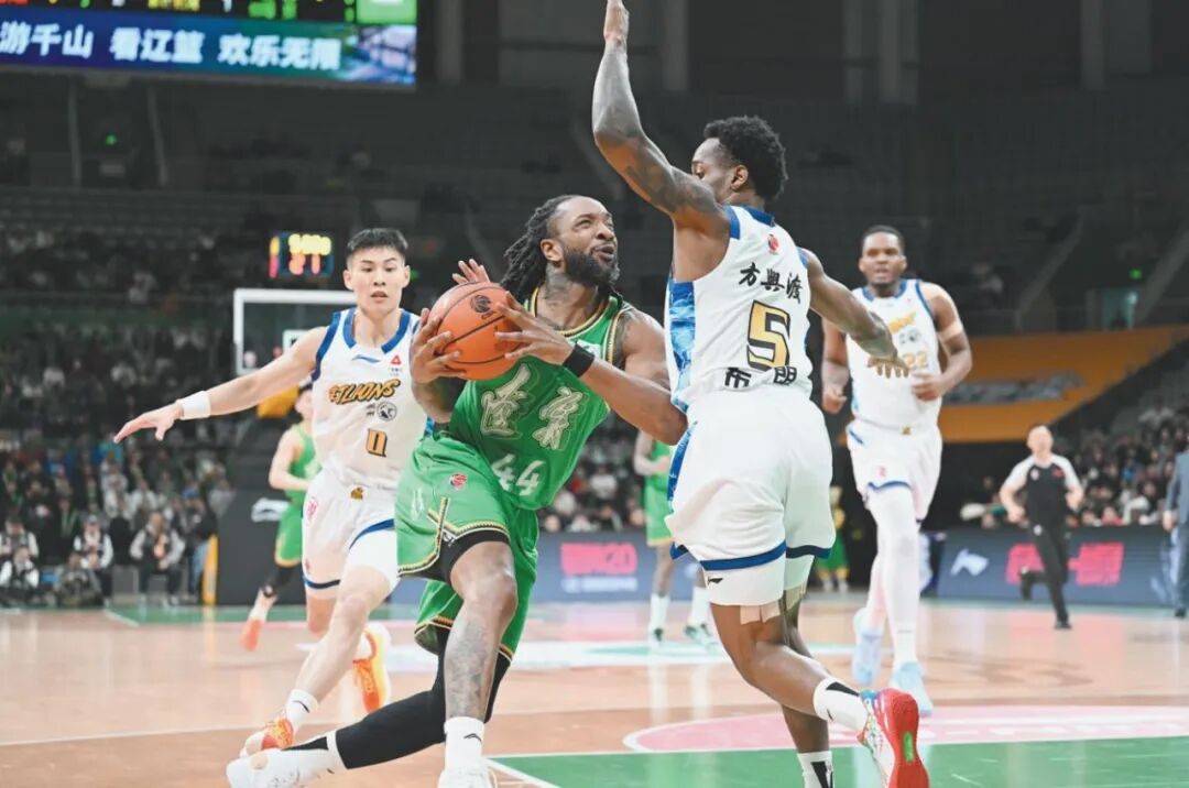 本赛季双方首场对决,辽篮球员威尔斯(左二)的犀利进攻令广厦队球员头疼。