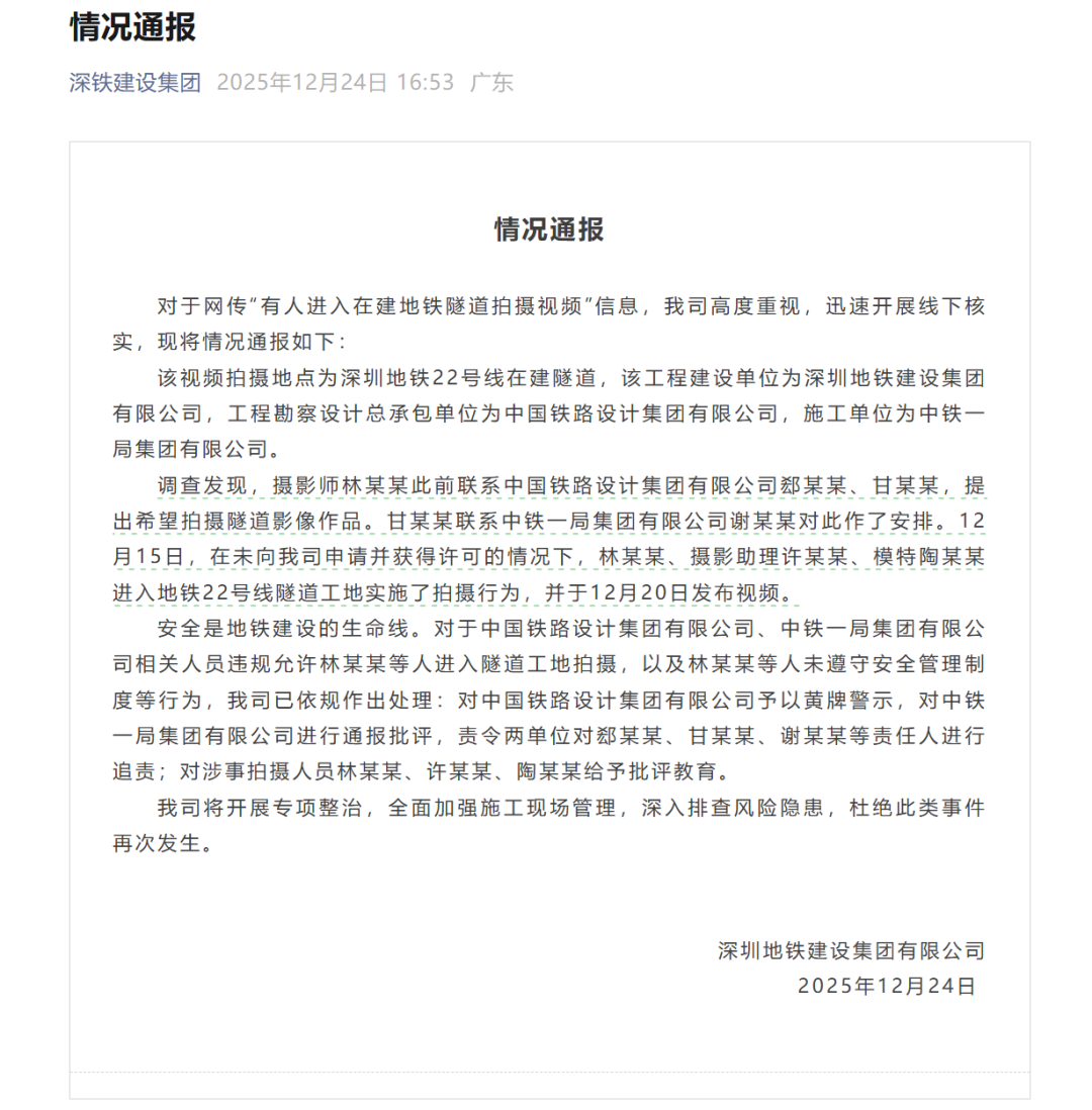 12月24日,深圳地铁建设集团有限公司发布一则通报,全文如下: