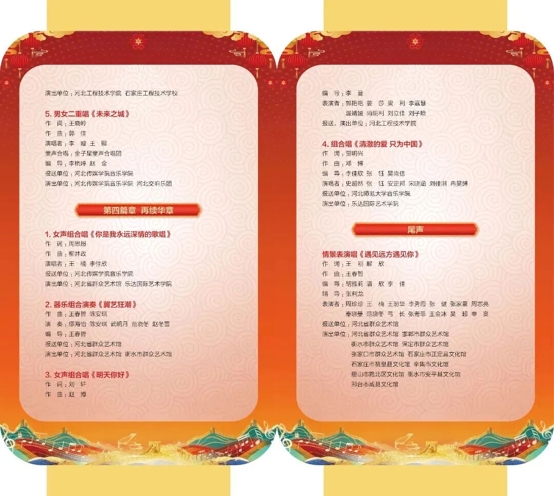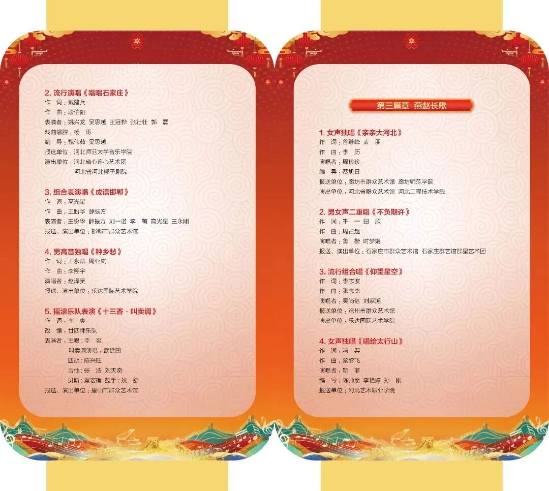 ●沉浸式篇章演绎:创新采用无主持人串联形式,依托视觉大屏和舞美灯光自然呈现“大美河北”“乡音乡情”“燕赵长歌”“再续华章”四大篇章,音画俱佳,全程无中断,沉浸式体验拉满!
