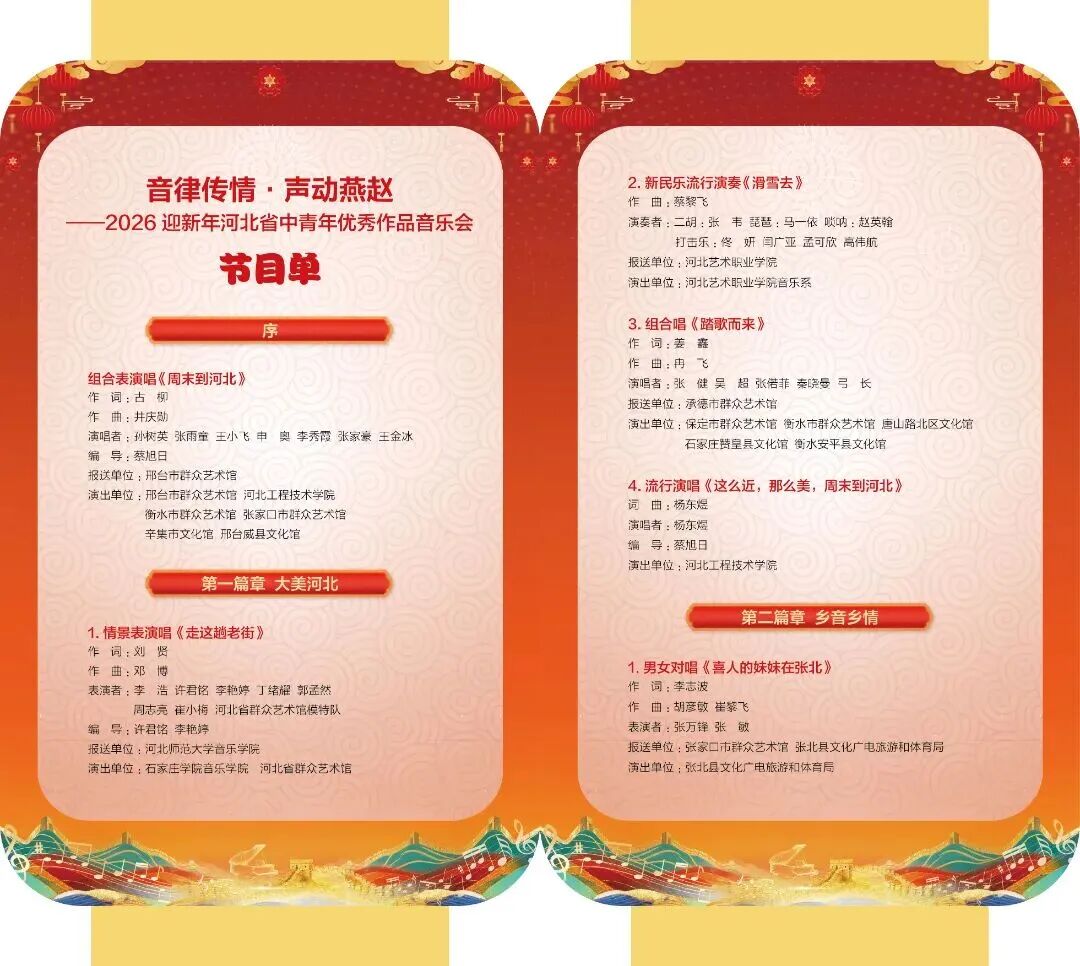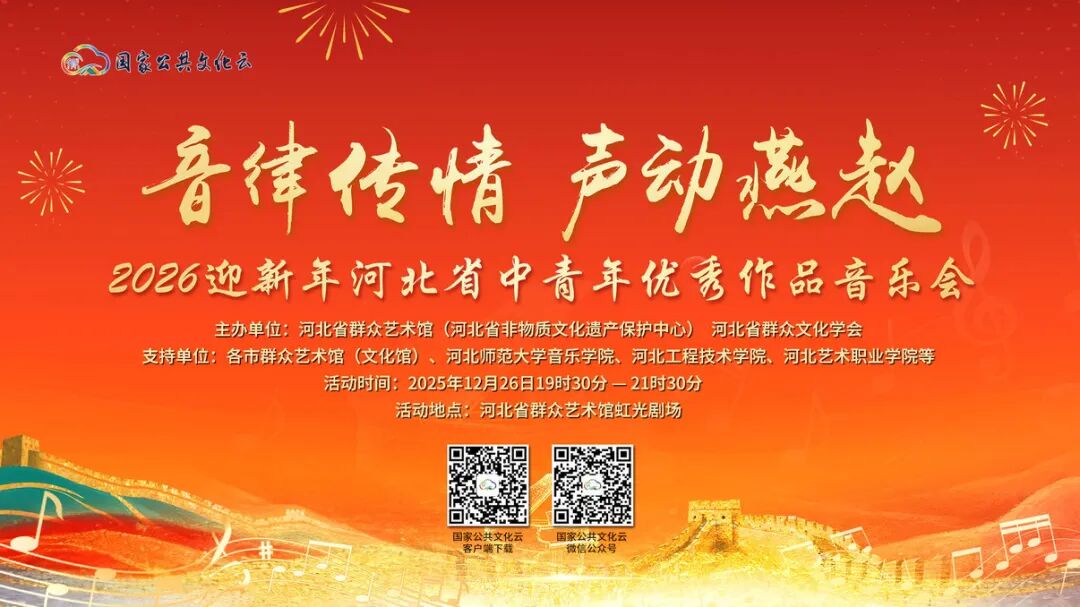 2025年已经进入倒计时,还在为如何辞旧迎新寻找灵感?拒绝千篇一律的岁末,用一场高品质音乐会为时光落款!12月26日19:30,由河北省群众艺术馆(河北省非物质文化遗产保护中心)、河北省群众文化学会主办,各市群众艺术馆(文化馆)、省内有关院校、社会团体支持的“音律传情·声动燕赵”——2026迎新年河北省中青年优秀作品音乐会即将奏响!