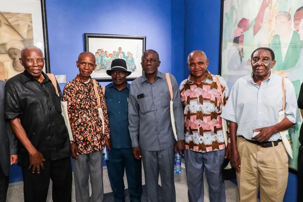 11月26日,在坦桑尼亚达累斯萨拉姆,坦赞铁路退休职工在“同路朋友——坦赞铁路采风绘画展”上合影。