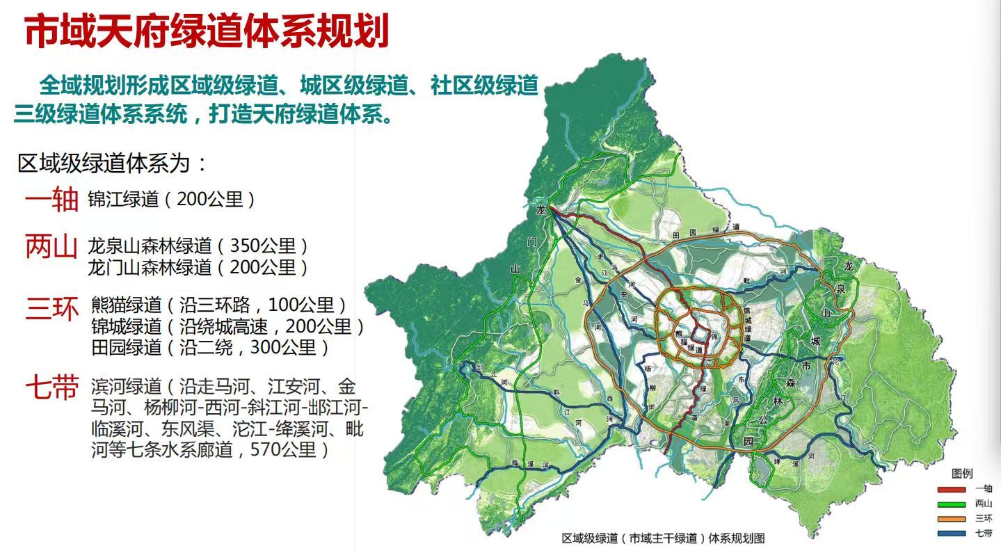 记者了解到,近年来,成都市实施“五绿润城”行动,以此引领优化公园城市生态空间结构,推动城市自然有序生长。其中“三绿”均涉及天府绿道建设,即:建设天府绿道体系打造活力“绿脉”,建设环城生态区打造超级“绿环”,建设锦江绿道打造精品“绿轴”。