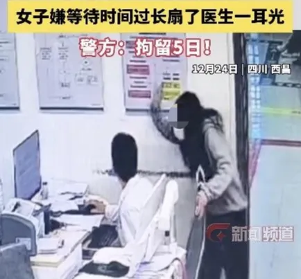 12月21日,在四川西昌一医院内,女子陪朋友就诊时,看见医生优先救治重症患者,因嫌等待时间过长,她趁医生不注意,突然怒扇其一耳光后逃逸。为此,女子被警方行拘5日。