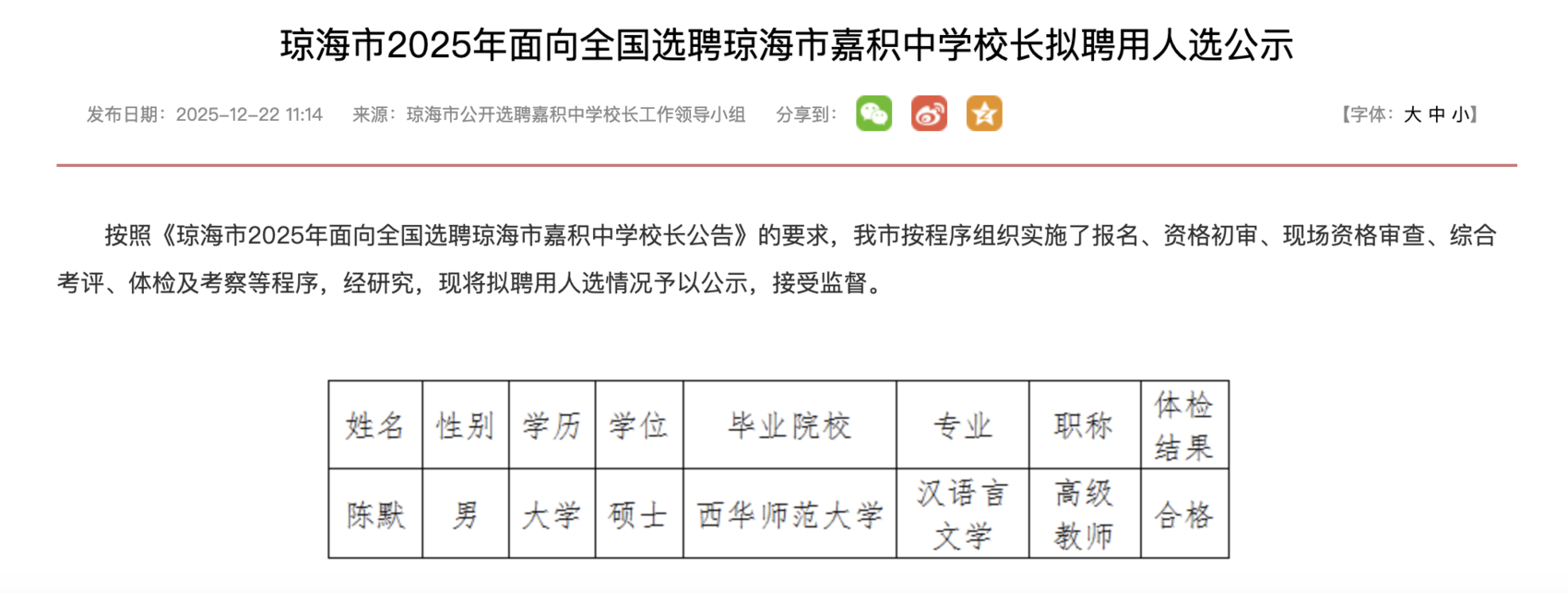 日前,“海南一中学百万年薪选聘校长”一事,引发网友热议。海南省琼海市政府官方网站发布的公告显示,该市2025年面向全国选聘琼海市嘉积中学校长,经报名、资格初审等程序,拟聘用人员为陈默。