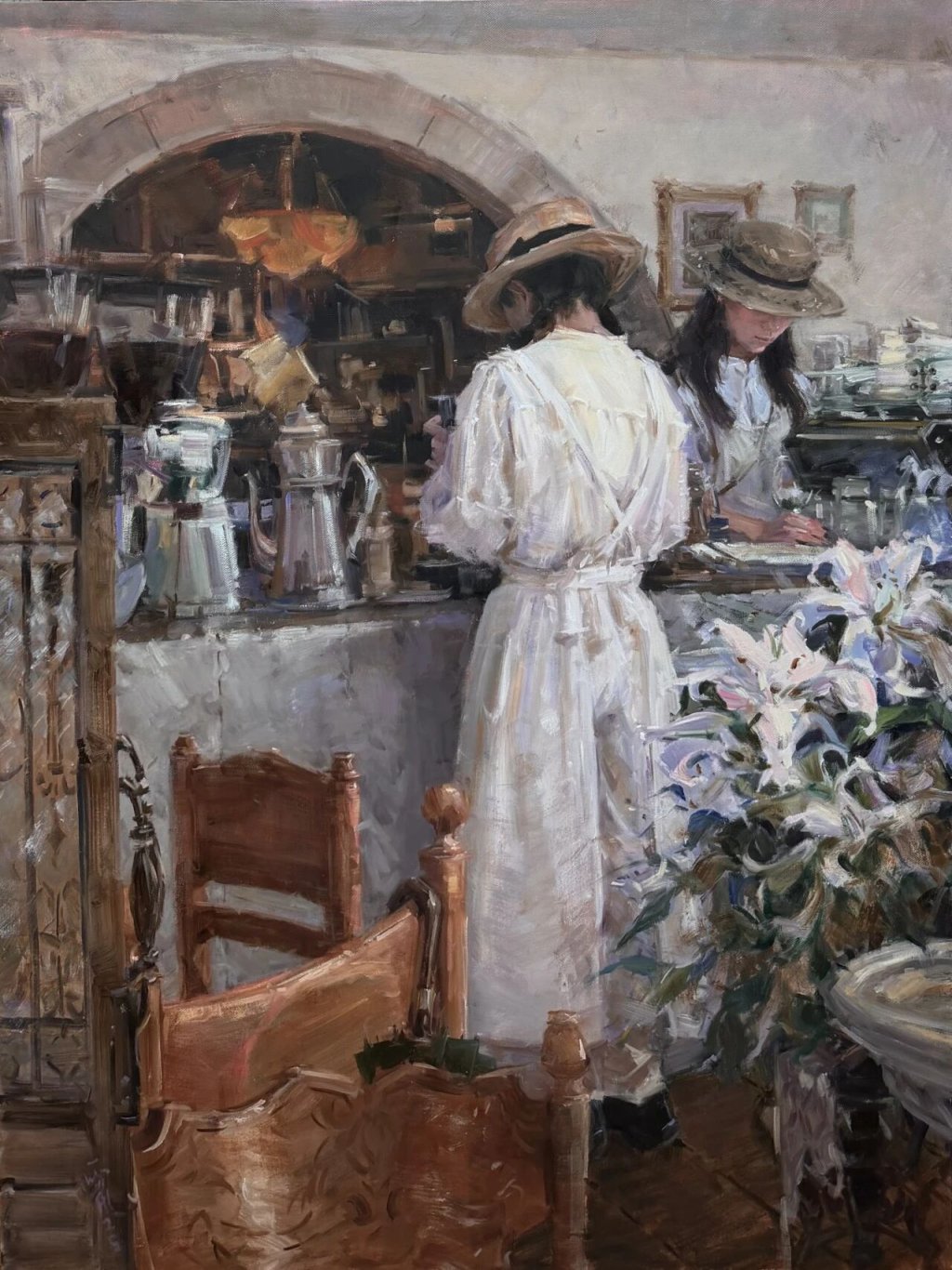 吴一箫是四川青年艺术家中的佼佼者,早在2013年,他就参与创作了“中华文明历史题材美术创作工程”作品《科举考试》。近年来,他的油画创作不断精进,尤其在主题、人物、风景等领域时有建树。正如评论家所言,吴一箫的作品没有过多华丽的修饰表达技法,深耕慢作,乐此不疲,每一步都走得踏实有力。这幅《周末的慢板》,画面中似乎为一家餐厅或咖啡厅,工作人员正埋头安静地做着准备工作,室内的布局陈设、人物的衣着风格等元素,都呈现出一种与作品名称相应的优雅格调,令观者在欣赏过程中不自觉地放松身心。