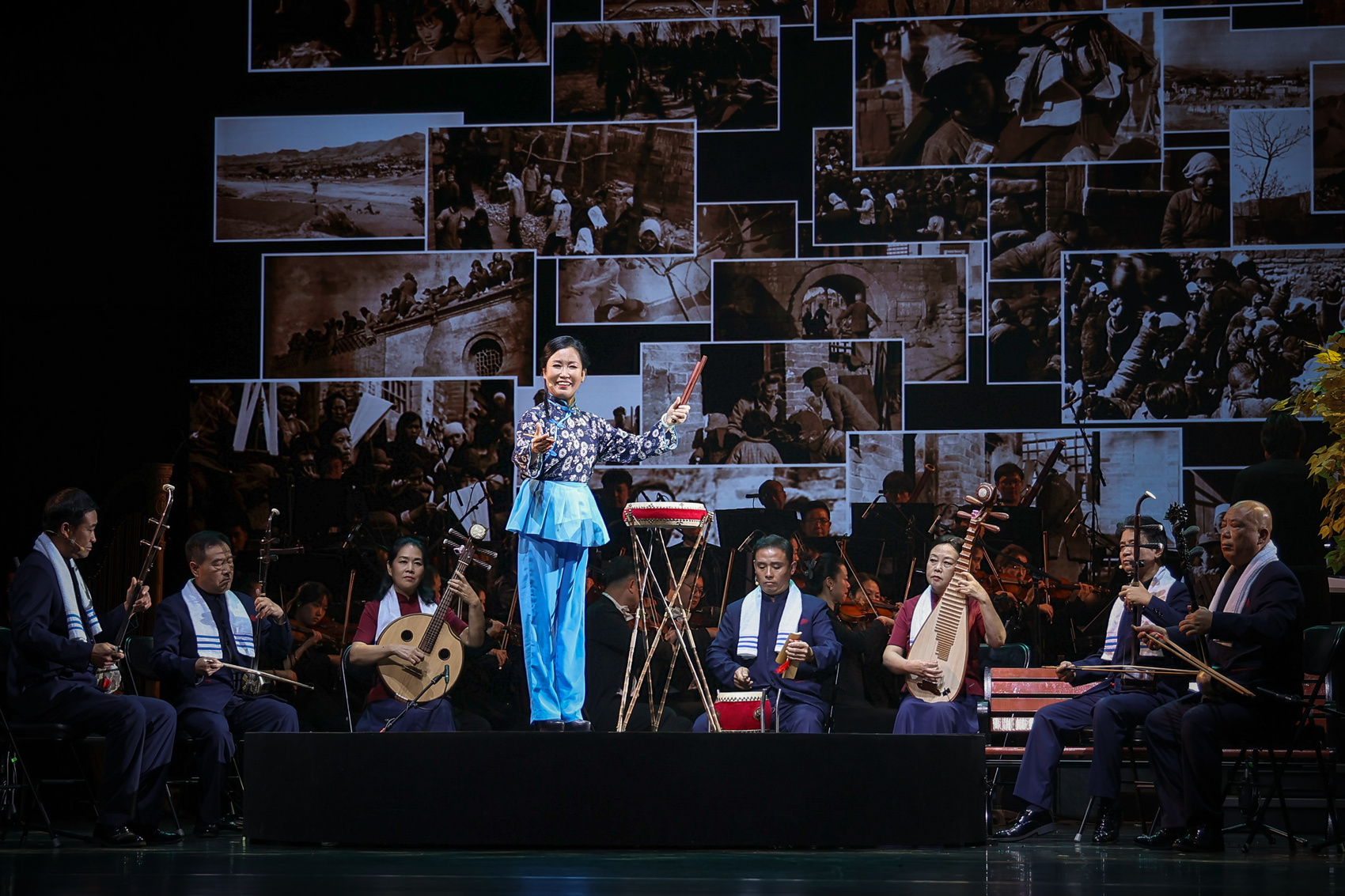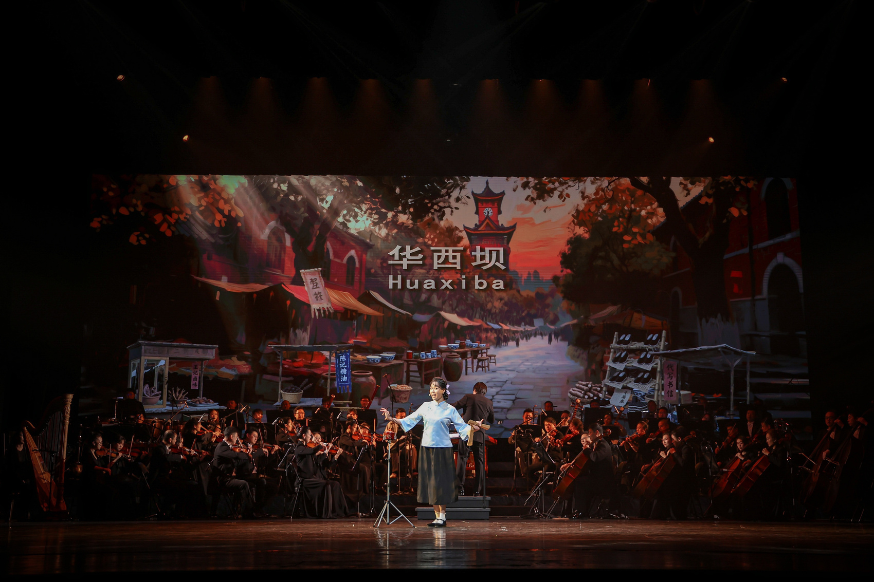 传统曲艺表演,舞台往往十分简单,一个麦克风、两个碘钨灯,所谓“照亮了、听响了”就行。9月16日北京首演时,罗捷身后却很“热闹”,不仅有AI生成的华西坝街景作为背景,还有庞大的管弦乐队为她伴奏。
