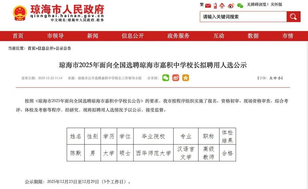 封面新闻记者在琼海市人民政府公示公告栏检索发现,8月4日,当地发布官方公告,面向全国公开选聘琼海市嘉积中学校长。