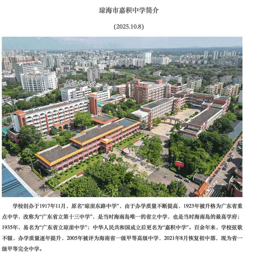 嘉积中学官网显示,该校是创办于1917年的省级名校,在海南基础教育领域中占据重要地位。