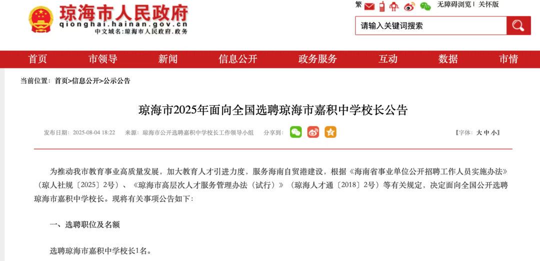 2025年8月,琼海市发布的全国选聘校长公告。官网截图