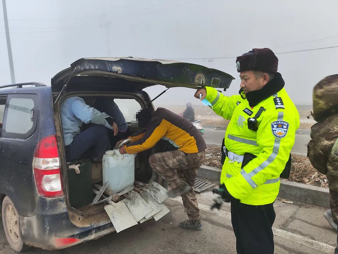 近日,济南市公安局交通管理支队槐荫区大队民警在济南西收费站出口执勤时,发现一辆深蓝色面包后尾门被多把铁锨别住,无法正常关闭,当即示意驾驶人靠边停车接受检查。