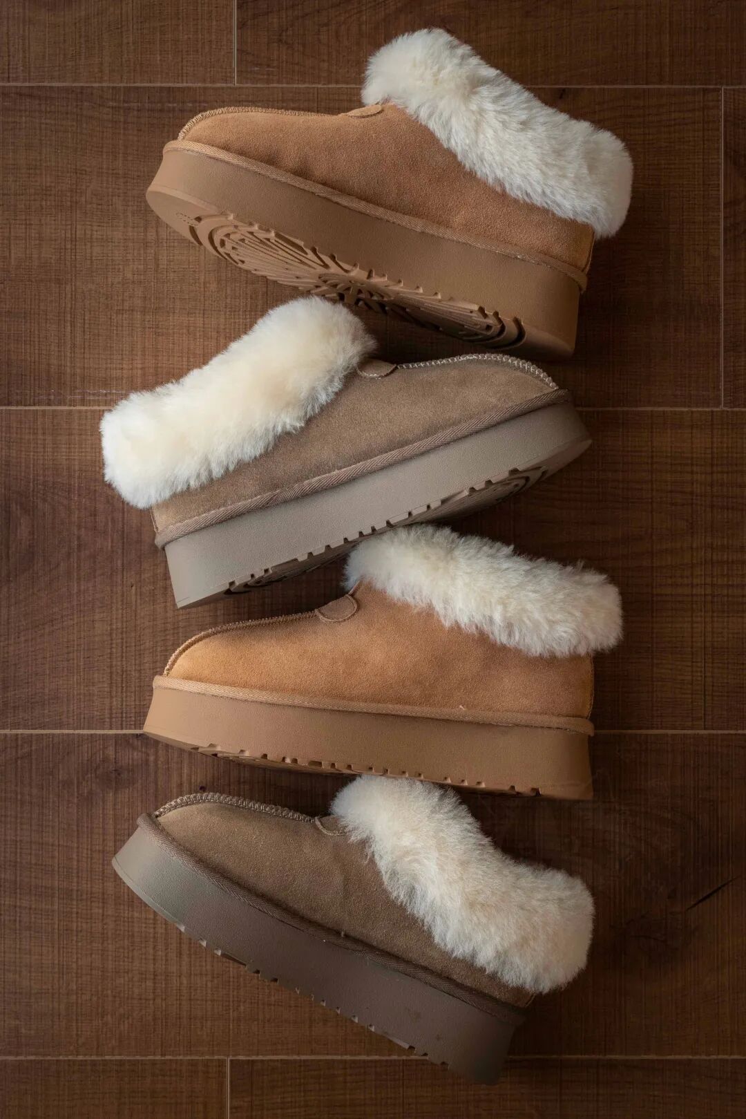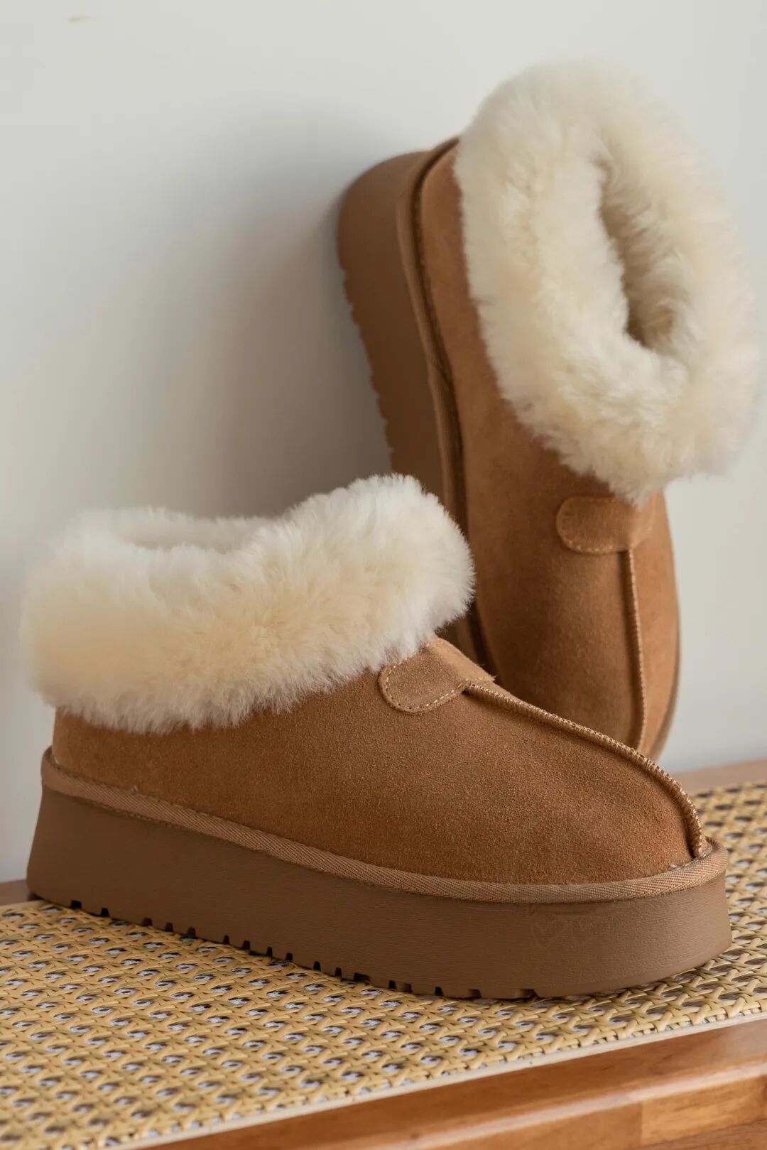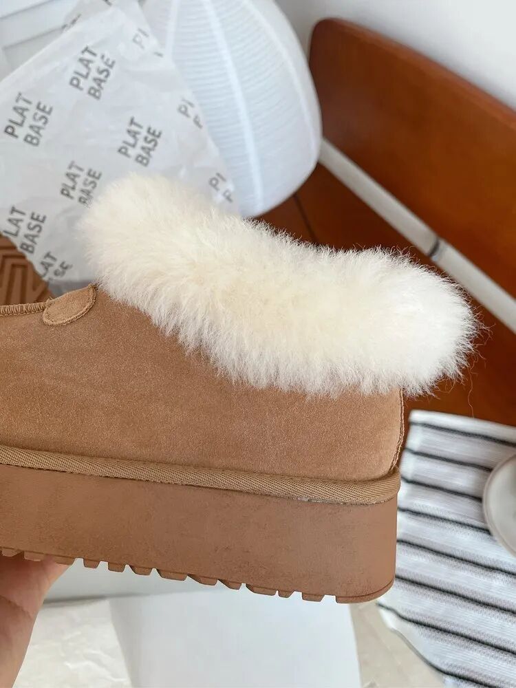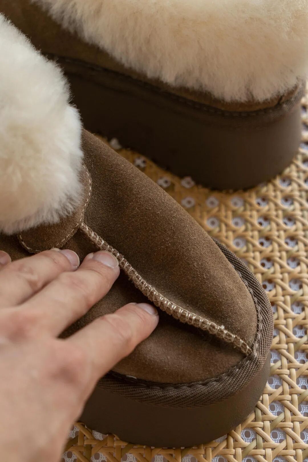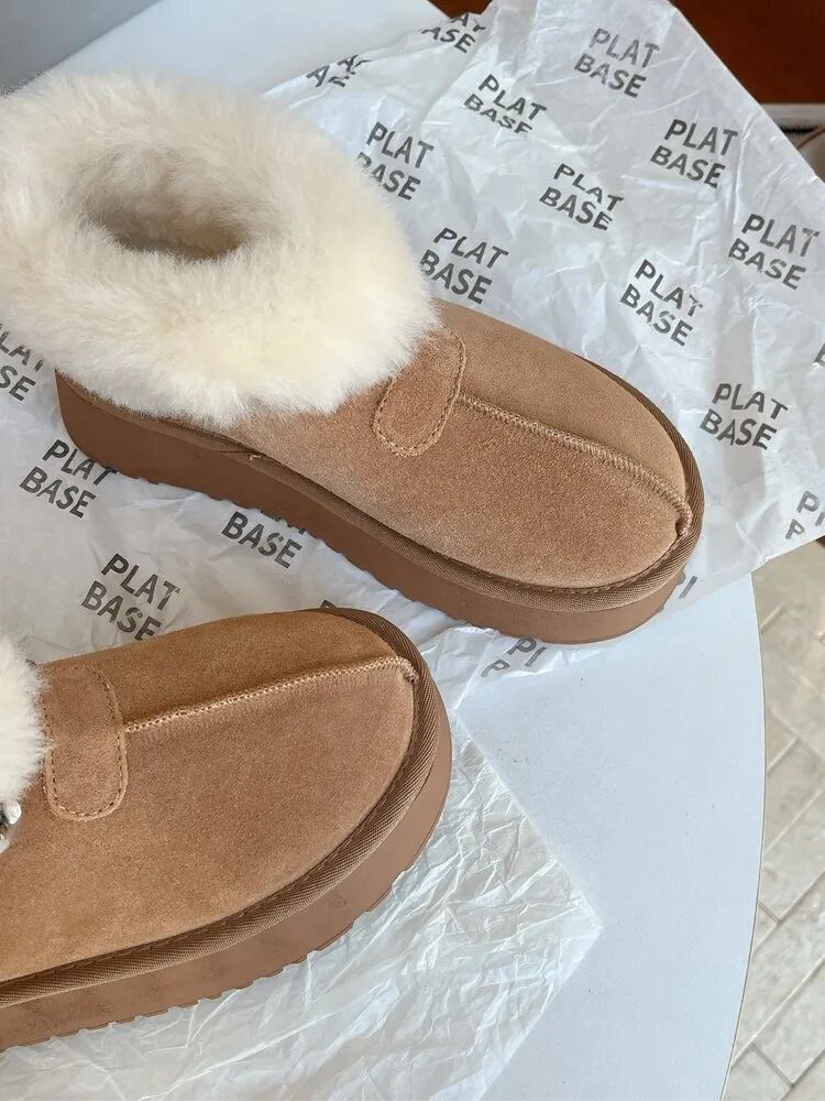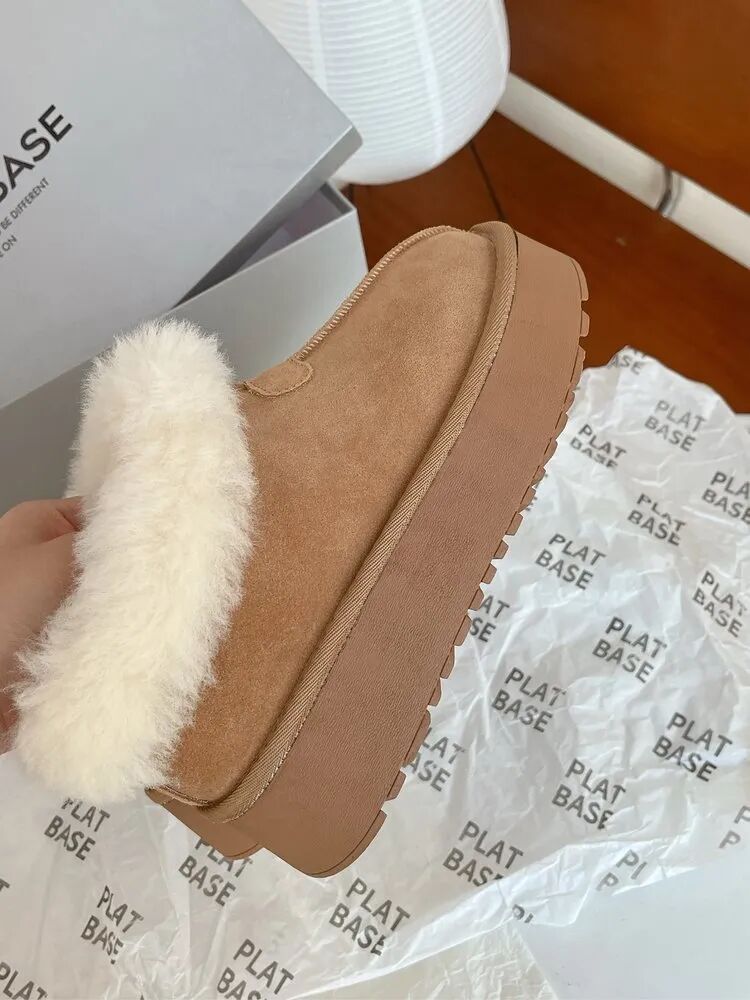 PLAT BASE 家靴口专属羊皮毛一体设计,不是分层假毛,是毛根连皮的真羊皮毛,裹脚腕如戴柔软羊毛领。