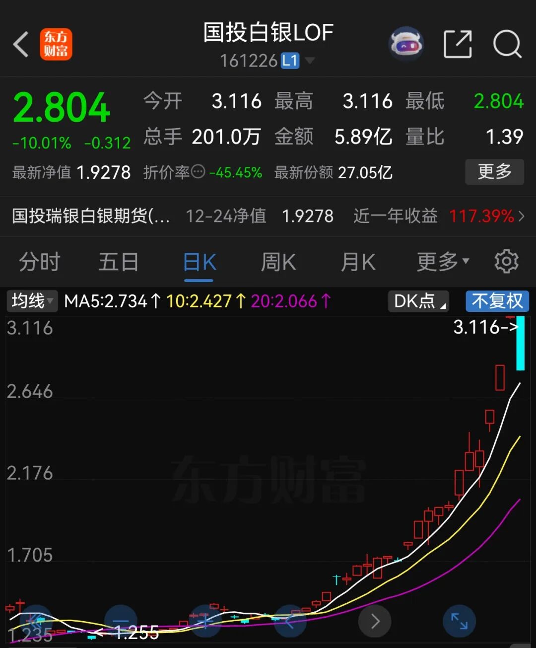 全市场唯一一只主要投资于白银期货的基金产品国投白银LOF,近日连续大涨。24日,该基金更是连续涨停3天,报收3.116元。