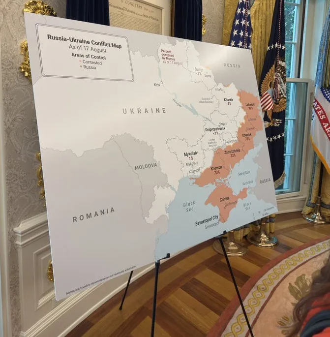 当地时间8月18日,美国总统特朗普与乌克兰总统泽连斯基在白宫椭圆形办公室会晤时,白宫展示出一张地图,图中已被俄罗斯控制的地区被标记为橙红色。资料图