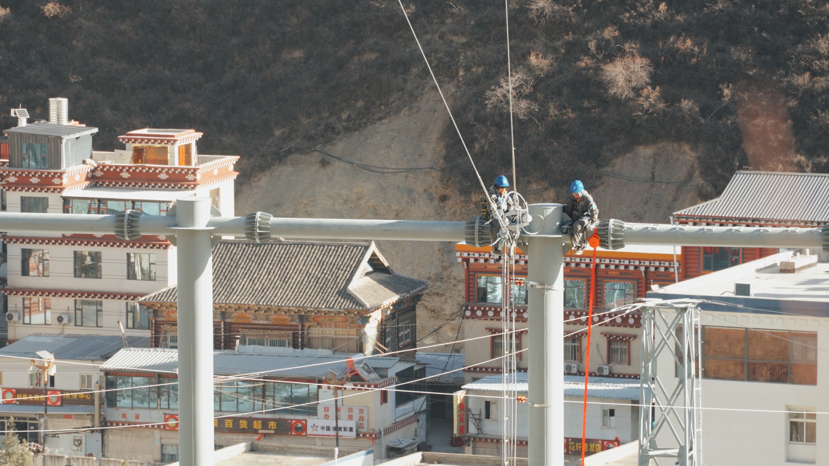 “本工程线路不长,但施工难度极大。工程沿线平均海拔超3000米,最高处达3600米,需跨越金沙江、降曲河等河流,是典型的高海拔复杂地形‘硬骨头’项目。”国网四川建设公司叶巴滩水电送出工程现场负责人陈自彬介绍,尤其N101塔至N103塔区段,现场坡度达50度,常规运输完全无法实施。“团队创新搭设双索循环式重型索道,累计运送物资超3100吨,成功破解悬崖峭壁间的物资运输难题,保障了关键塔位施工进度。”