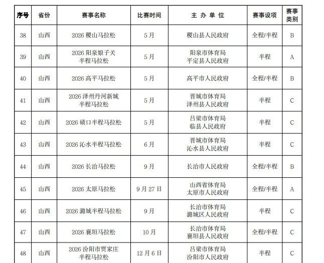日前,中国田径协会正式发布《关于公布2026年马拉松赛事目录的通知》,2026年全国预计将举办492场马拉松赛事,包括254场A类赛事、67场B类赛事及171场C类赛事。根据目录显示,2026年,山西省将举办13场马拉松赛事,覆盖了8个地级市。